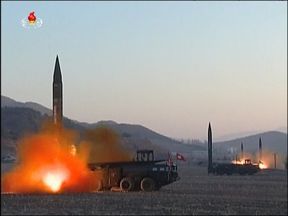 North Korean state media said the launches of the four banned missiles were training for an attack on a US base in Japan.