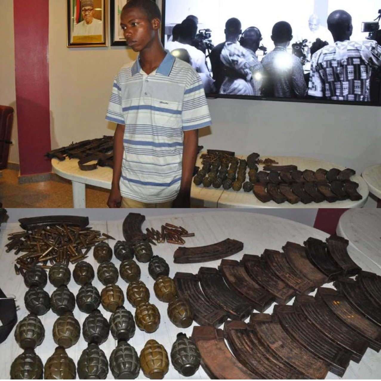 When Mohammed was arrested in Kumbatso, Kano, a search was conducted at his residence wherein dangerous weapons including eight AK-47 rifles; 20 fully loaded AK-A7 magazines; 27 hand grenades; 793 rounds of live ammunition; one gas cylinder; three laptops; one GSM phone; one Lifan motorcycle; one Honda Civic Car (Ash); and one printer.